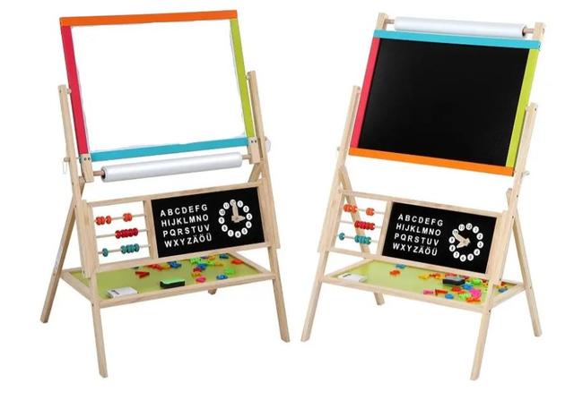 Дошка встановлена на дерев’яній рамі з поличкою для аксесуарів і розкладною конструкцією, що дозволяє швидко скласти мольберт після гри. У нижній частині розміщено рахівницю та годинник зі стрілками - для вивчення цифр і часу.